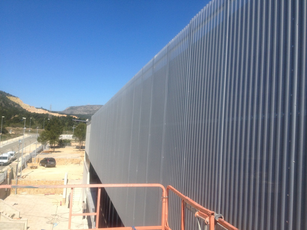 Recubrimiento de fachada con chapa onda microperforada en Pádel 9 de L'Hospitalet de l'Infant